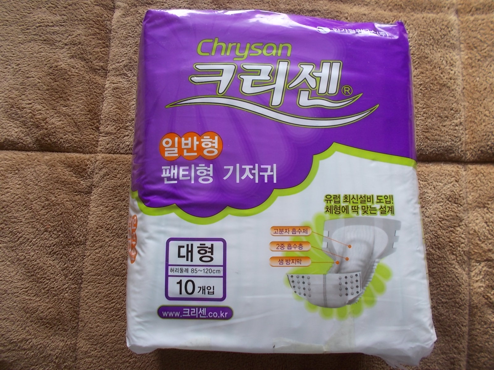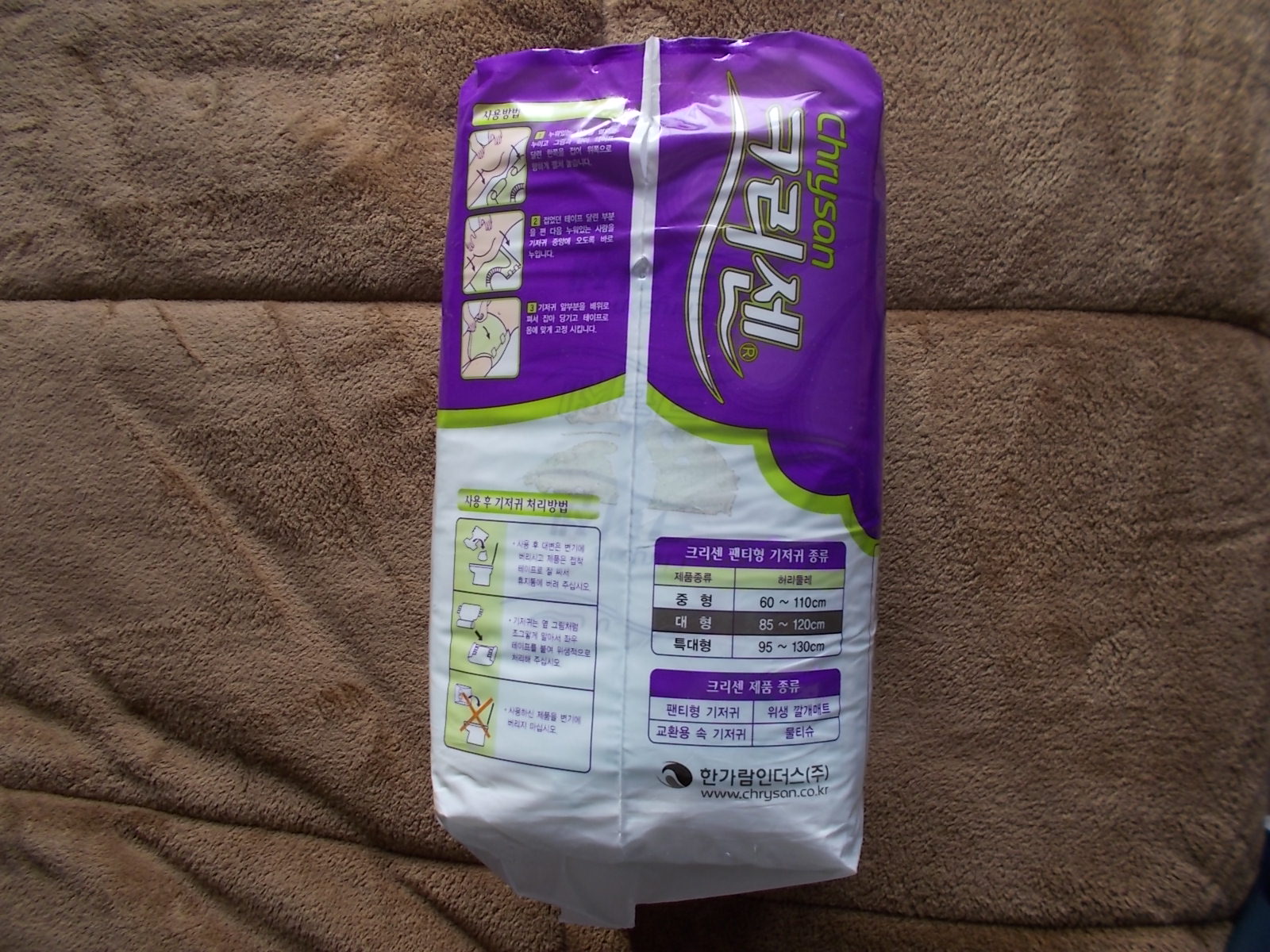 Our world traveler, Tewi, has provided more photos of local brands of diapers available in Mongolia. The Chryson diaper costs U.S. $7.11 for a package of 10, or 71 cents each. The diaper has a plain front taping panel. Tewi notes that an open package of diapers was available so that buyers could purchase only a few diapers.