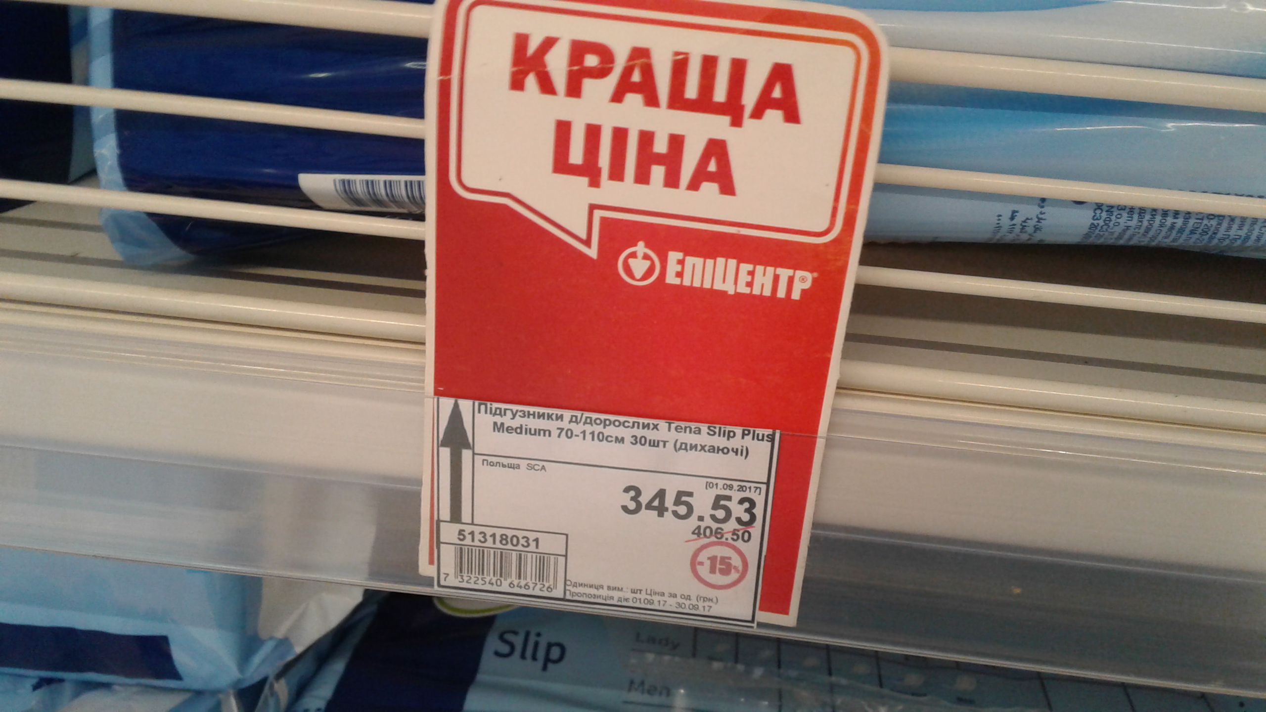 Hi folks, we are back in Ukraine and I found Tena Slip Plus diapers being sold in store called Epicenter, which is like Home Depot, but also sells clothes, plants and health and beauty aids. It's huge and has quite a lot of products. The price for a pack of 30 is $13 US Dollars. I was able to buy a package of 10 Seni Super Plus medium diapers for about $8.00 Dollars. That was at a pharmacy near where we are staying.