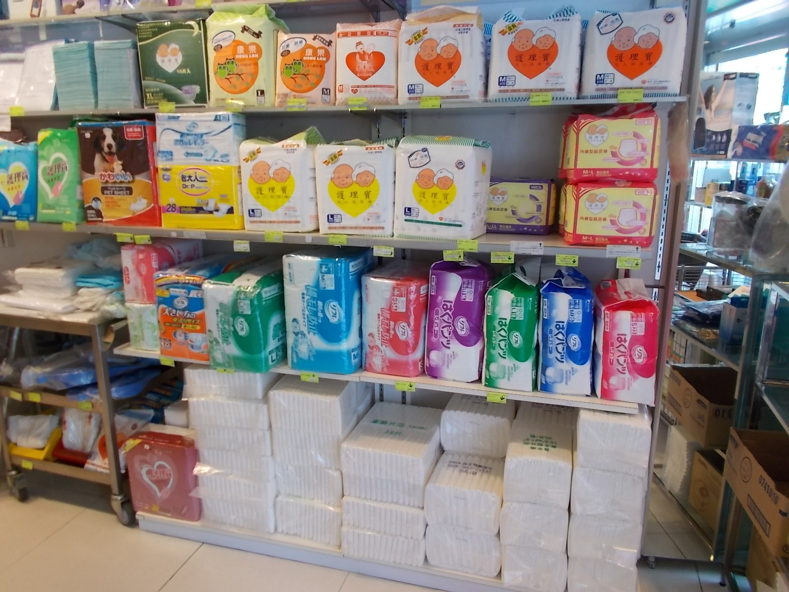 Tewi has provided photos of “Hong Kong Medical Supplies” and notes that he actually buys diapers at this store. You will see that the store carries Molicare and Tena, in addition to local brands.