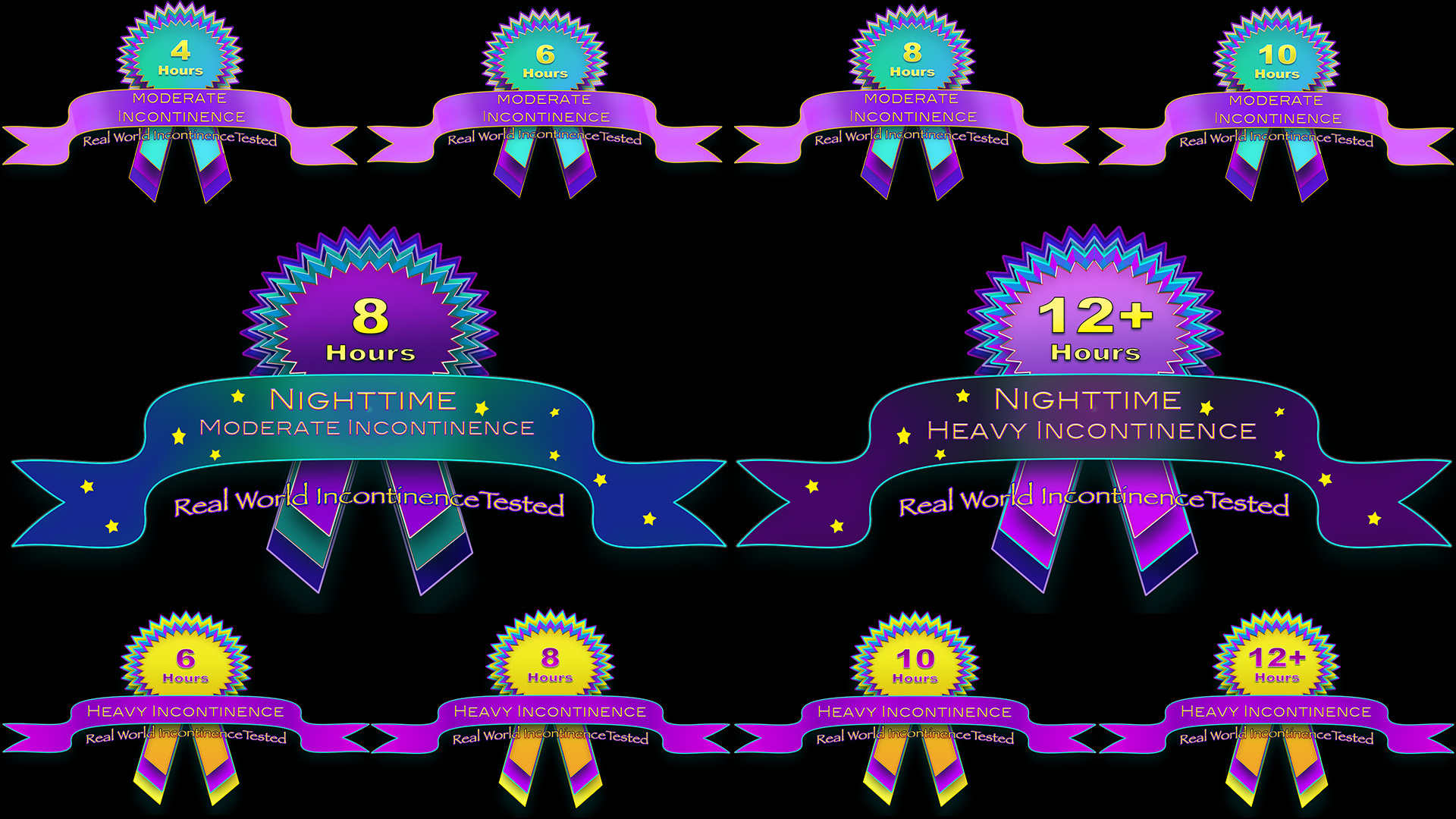 Nighttime products will be broken in up into Moderate and Heavy but must be able to absorb at least 800ml or 8hrs (100ml per hour) and not leak in "Lying down, Standing and Belly Sleeper tests, because of our "Side Sleeper" tests are hard for many/most products to pass we will not require them to pass the 400ml test.